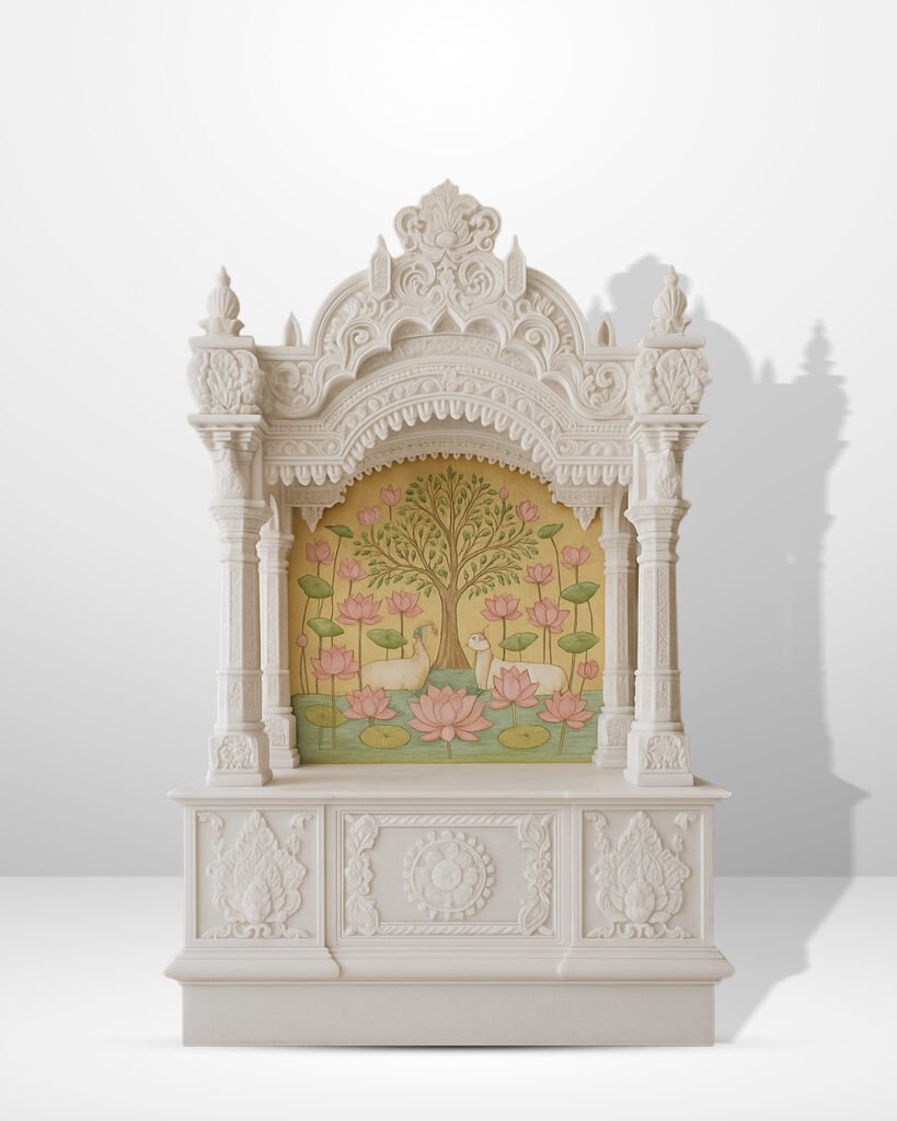 Kamalvan is a celebration of divine stillness blooming through nature’s rhythm. Hand-carved in Makrana white marble, this mandir finds its soul in a hand-painted lotus grove, where sacred deer rest beneath a flowering tree symbols of grace, innocence, and inner peace.